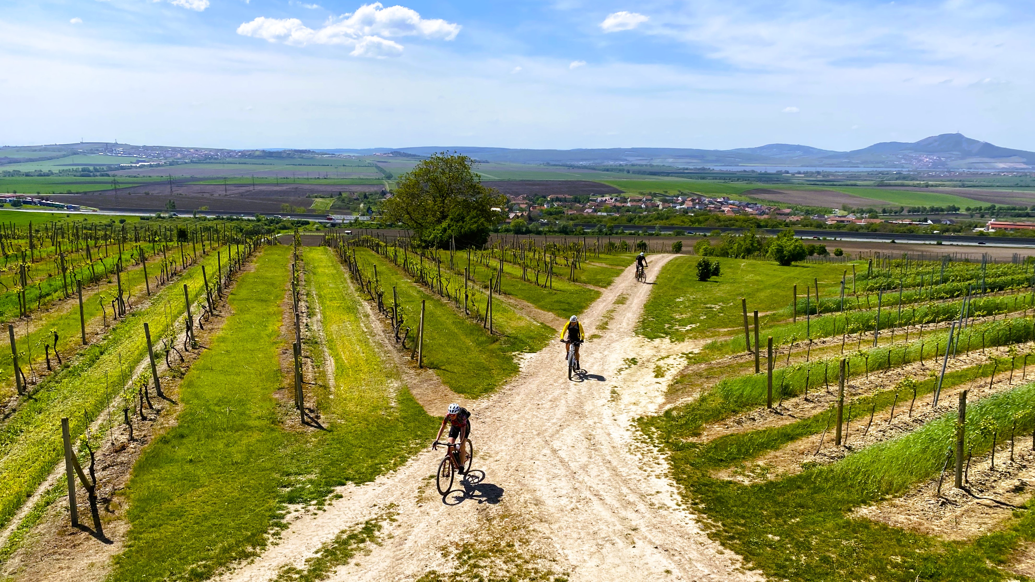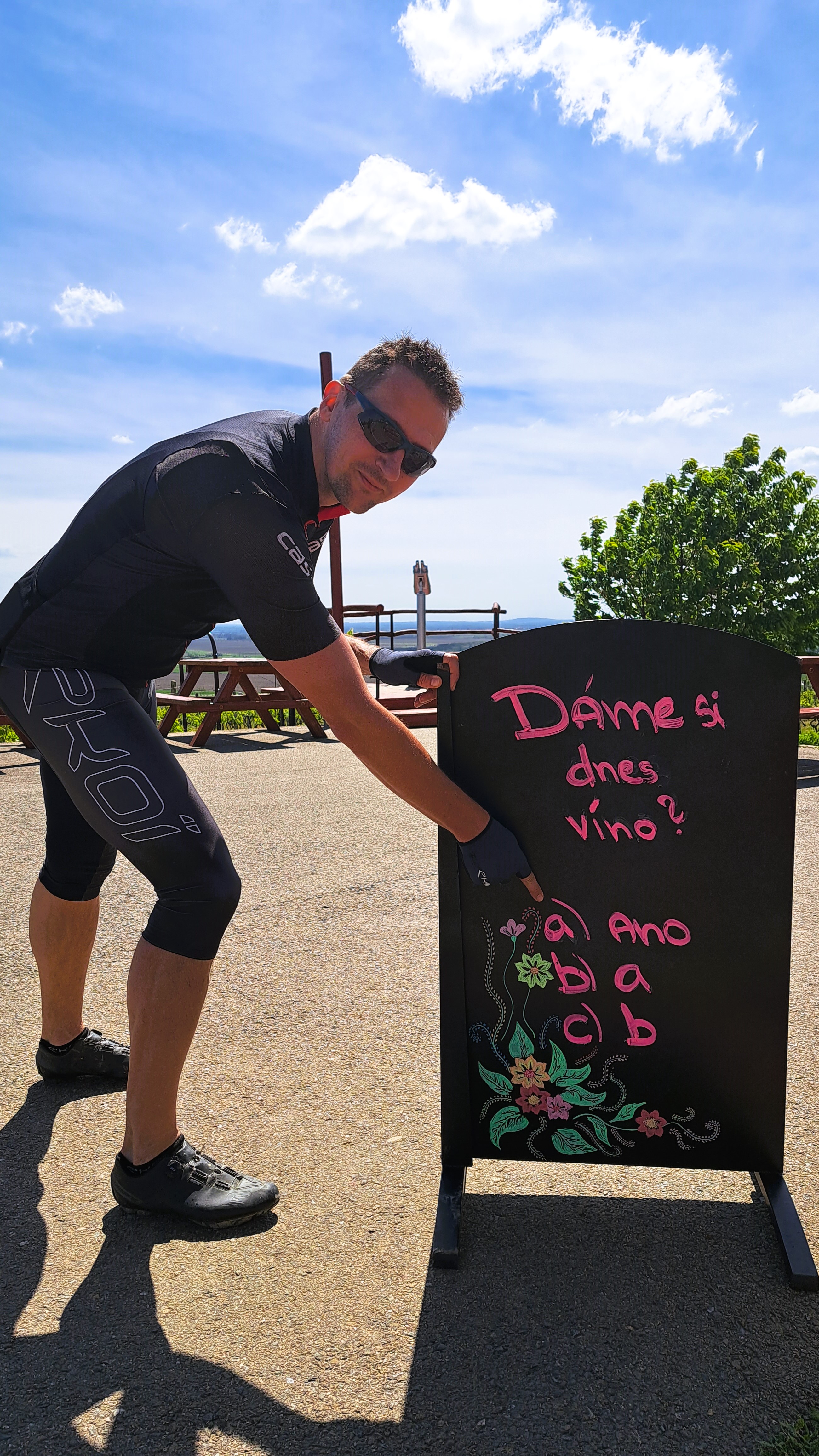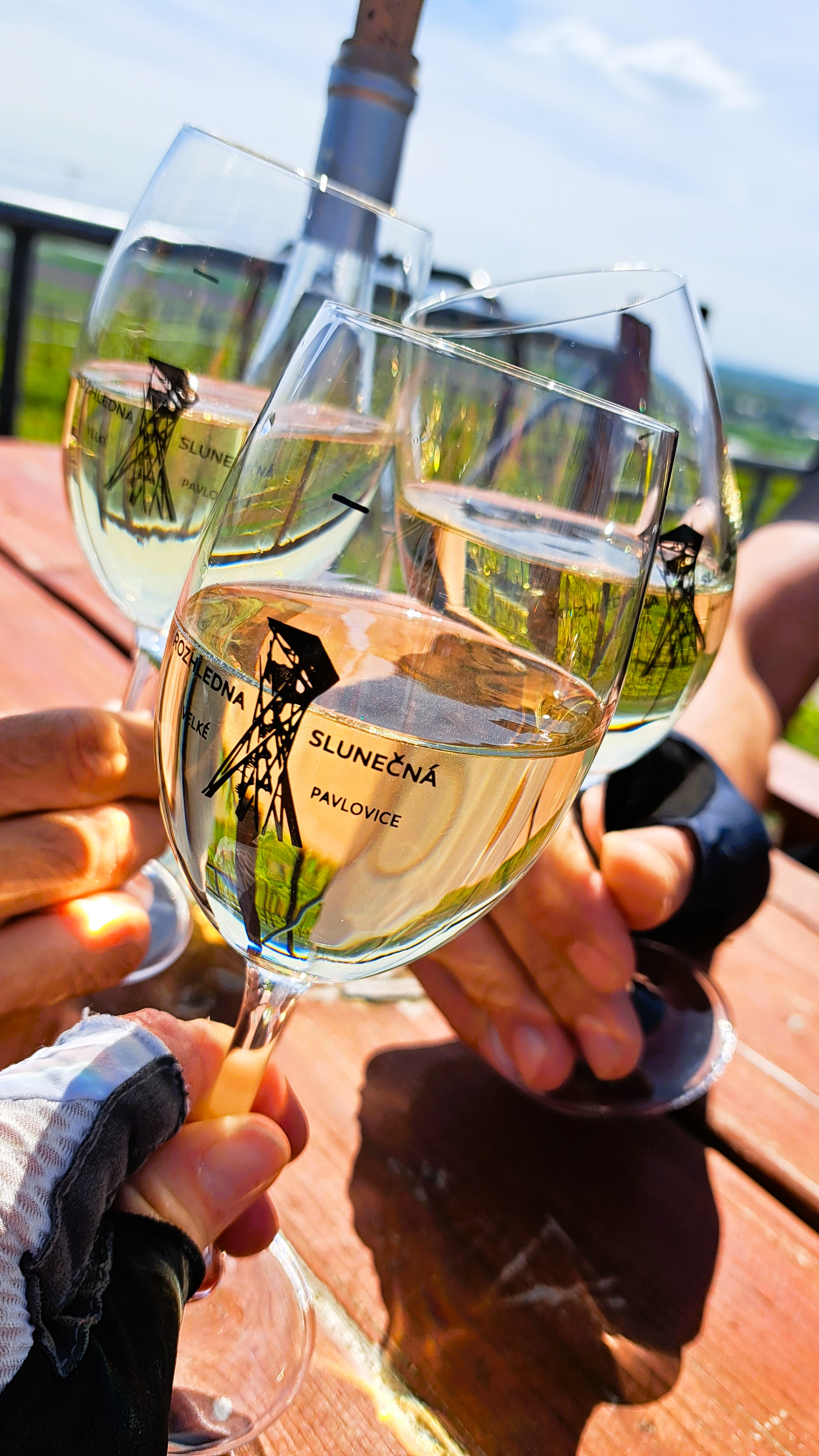 jsme rádi, že jste si vybrali jako doprovodný program právě cyklistický výlet. Naše dobrodružství začne ve 14 h na parkovišti před hotelem, kdo má zamluvené kolo, najde ho na tomto místě. Potom společně vyrazíme po plánované trase https://mapy.cz/s/kuzegetehe> vstříc čtyřem kopečkům a dvěma rozhlednám (U obrázku, Slunečná). Odtud se budete moci pokochat pohledem nejen na okolní rozkvetlé vinohrady, ale na dosah ruky budete mít i vodní nádrž Nové mlýny (největší vodní plocha na Moravě) a za ní tyčící se Pavlovské vrchy, které jsou součástí chráněné krajinné oblasti Pálava. U rozhledny Slunečná je příjemné občerstvení, kde budeme moci ochutnat místní vína. Vzhledem k tomu, že po sportovním výkonu je nutná i regenerace, bude na nás čekat hotelové wellness s parní a finskou saunou a příjemným vodním barem, které bude jen pro nás bikery :-)